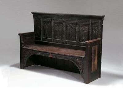 The foliate carved and linen fold panel back over a solid seat and mask carved arched apron, raised on stile feet. H: 48 1/2, W: 73, D: 22 in.