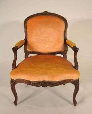 The shaped and floral carved salmon colored upholstered back with downswept upholstered arms, the overstuffed seat raised on carved cabriole legs united by a carved serpentine apron.