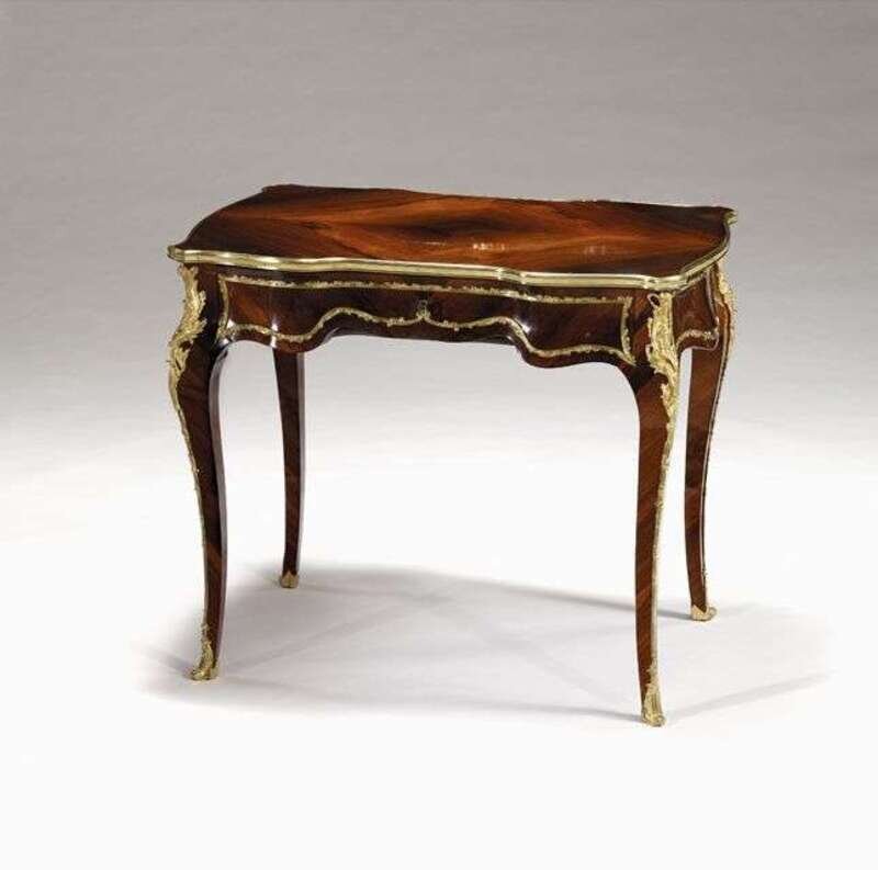 The quarter-veneered shaped top with outset corners over a single long frieze drawer, raised on tapering gilt bronze corner mounted cabriole legs terminating at sabots. H: 29, W: 33 1/2, D: 23 in.