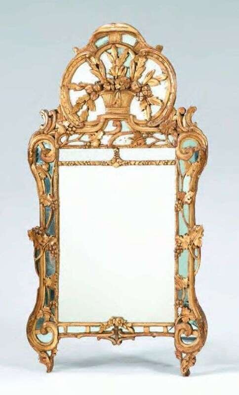 The rectangular plate with fruiting vine carved margin plates, surmounted by a flower basket, reserved against further mirrored plates.