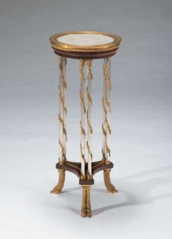 The round marble top within a gilt bronze mounted frame, supported on vine twisted silvered bronze double columns united by a rosewood undertier, raised on gilt bronze cloven hoof feet.Footnote: Francois Ignace Papst, maitre in 1785.