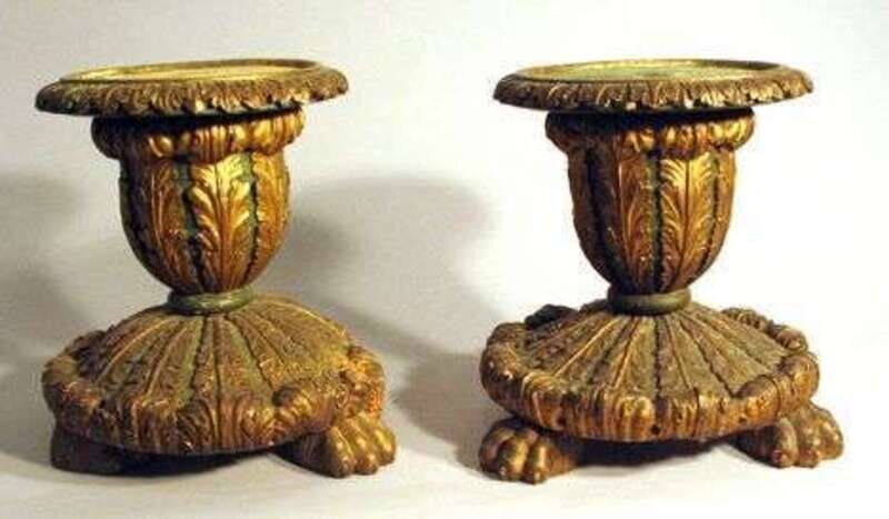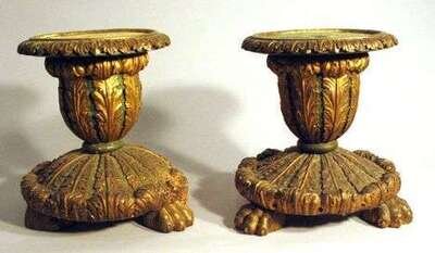 The acanthus carved urn shaped stands with dish tops, raised on circular bases with paw feet (distressed).