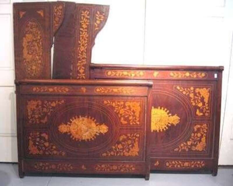 Inlaid throughout with scrolling foliage, the head and foot board centered by a stylized flower head motif. W: 54 in.