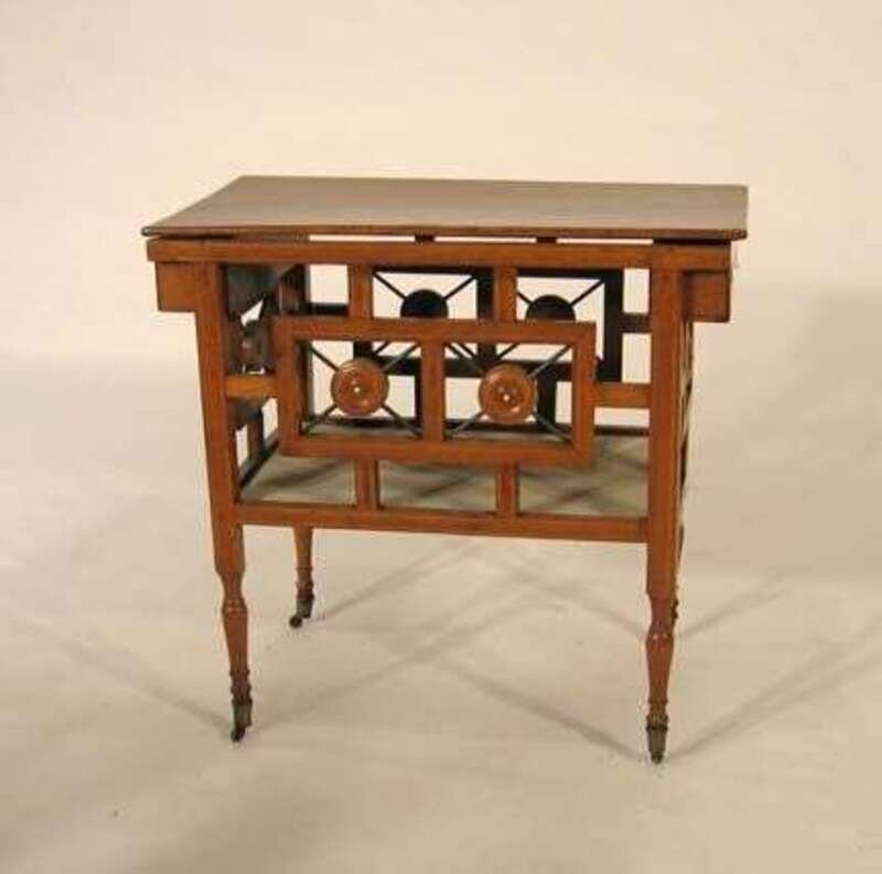 The hinged rectangular top opening to reveal the openwork basket flanked by two small compartments, raised on turned legs, terminated in casters.