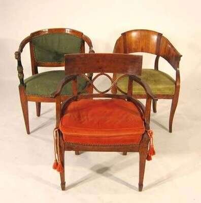 The upholstered curved back and curved arms with masked carved arm facings, the upholstered seat on square tapered legs; together with two similar tub chairs. (3).