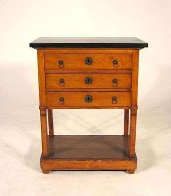 The rectangular marble top, over three long drawers, raised on columnar legs united by an under tier with block feet. H: 32 1/2, W: 25, D: 14 in.