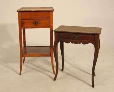 The serpentine hinged top enclosing a mirror and void interior over one frieze drawer, raised on splayed square legs united by an under tier, H: 27 1/2, W: 14 1/2, D: 13; together with a small Louis XV provincial side table, late 18th century, the canted rectangular top over a frieze drawer and shaped apron, raised on square cabriole legs. (2).