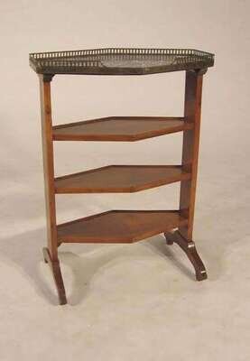 The diamond shaped gray and white marble top with a surrounding pierced brass gallery over three conforming shelves raised on outswept feet.