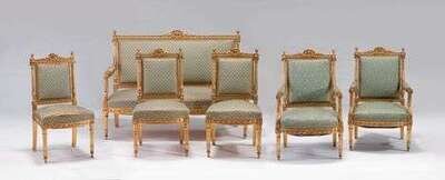 Comprising a settee, pair of fauteuils and three side chairs, the foliate carved square backs downswept acanthus scroll arms and stuffed overseats covered in patterned green fabric, raised on stop fluted turned tapered legs. Settee W: 56 in.