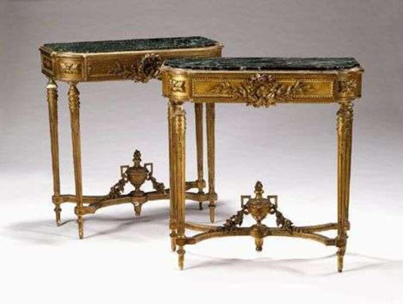 The later green marble tops over breakfront paneled friezes centered by ribbon tied floral wreaths, raised on stop fluted turned tapered legs united by an X-shaped stretcher, surmounted by urns and floral swags.