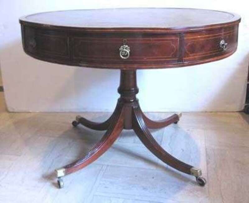 The circular top with an inset leather writing surface over three real and three dummy drawers, the turned column supports ending in four reeded downswept legs with brass cappings and casters. H: 29, Diam: 41 in.