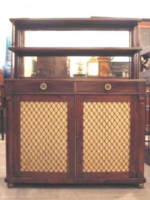 The galleried superstructure with two mirrored panel open shelves, the lower section with two frieze drawers, over two grille panel doors, raised on bun feet. : 59 1/2, W: 47, D: 14 in.