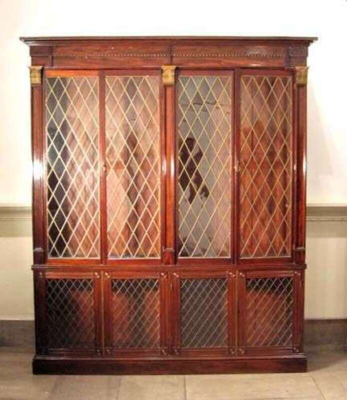 The molded cornice above a bead molded frieze, the top section with astragal glazed doors, flanked and divided by recessed panel pilasters headed by palmette carved corbels, the lower section with square molded and carved rounded block corner door frames enclosing glazed panels fronted by lattice grillwork, raised on a plinth base.