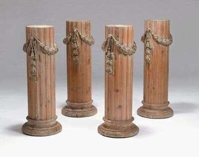 Tops lacking, of fluted cylindrical form carved with laurel leaf tassel tied swags, raised on ogee molded circular bases.