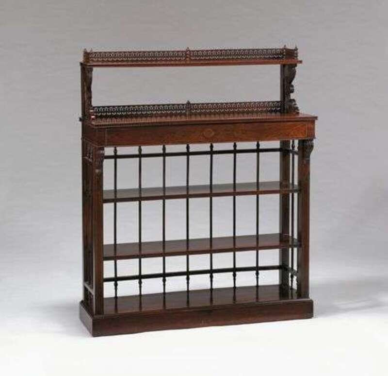 The fret pierced galleried back over one frieze drawer, with three open galleried shelves, raised on a plinth base. H: 54, W: 44 1/2, D: 15 in.