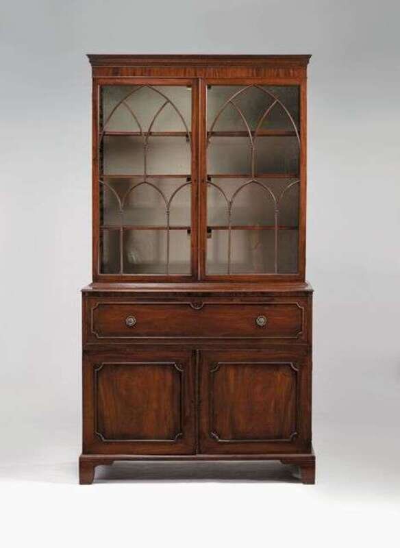 The molded cornice with a plain frieze over two arched astragal glazed doors enclosing a shelved interior, the lower section with a fitted secretaire drawer over two paneled cupboard doors raised on bracket feet.