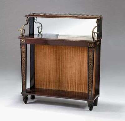 The galleried back raised on two brass serpent supports, over a rectangular top raised on brass inlaid tapered supports, united by an under tier and ending in turned tapered feet. H: 48 1/2, W: 42, D: 15 1/2 in.