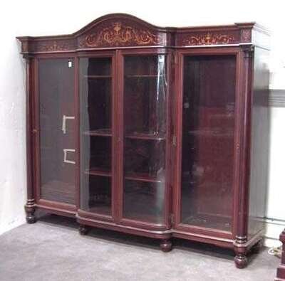 The arched checker banded cornice above a frieze inlaid with ho ho birds, dolphins, fruiting urns and scrolling foliage, below are four glazed panel doors, opening to reveal adjustable shelves, flanked by Doric pilasters and raised on turned bun feet.