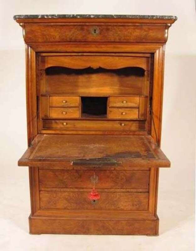 The gray and white rectangular marble top over a single frieze drawer, the fall front opening to reveal a fitted interior and an inset leather writing surface, above three long drawers raised on a plinth base.
