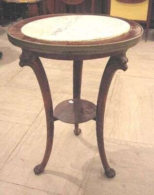 One with an inset white marble top on three carved sabre legs headed by griffins, united by a stretcher, terminating in paw feet, the other with a green marble top raised on a conforming tri-form base.