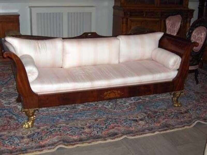 Covered in light pink striped fabric raised on carved giltwood claw feet.