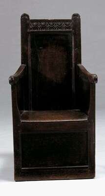 The carved top rail and plain back flanked by rear stiles with arched and crescent carved finials, over a boxed panel seat and base. H: 44 1/4, W: 23, D:19 in.