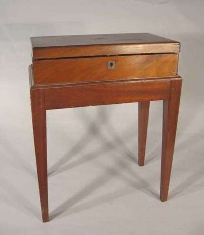 The rectangular hinged top centered by a brass medallion opening to reveal an inset baize lined writing surface with adjoining compartments, on a later stand with square tapered legs. H: 24 1/4, W: 17, D: 10 in.