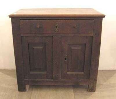 The molded top over a frieze drawer and two fielded panel cupboard doors, opening to reveal four further drawers, raised on stile feet.
