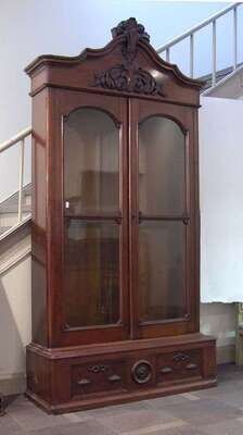 The foliate carved domed top over two glazed panel doors, enclosing shelves, below are two apron drawers, raised on a plinth base. H: 110, W: 54, D: 19 in.