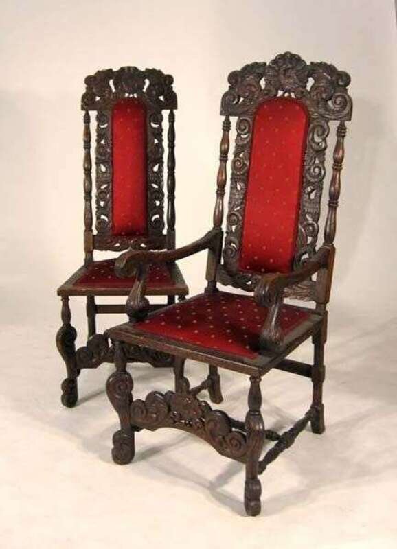 Including two armchairs, the pierced scroll carved backs and padded seats covered in red and gold fabric, raised on carved scroll legs united by turned H-shape stretchers.