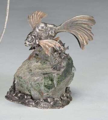 The naturalistic hardstone base, surmounted by a carp, the apron applied with a silver wave form base. H: 8 in.