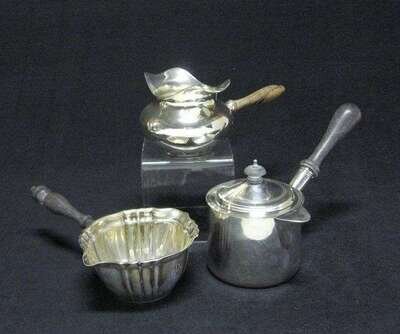 One Gorham, stamped Chippendale, J.E. Caldwell, one by Preisner, the other a covered example stamped sterling silver, all with a turned wood handles. 29 oz.