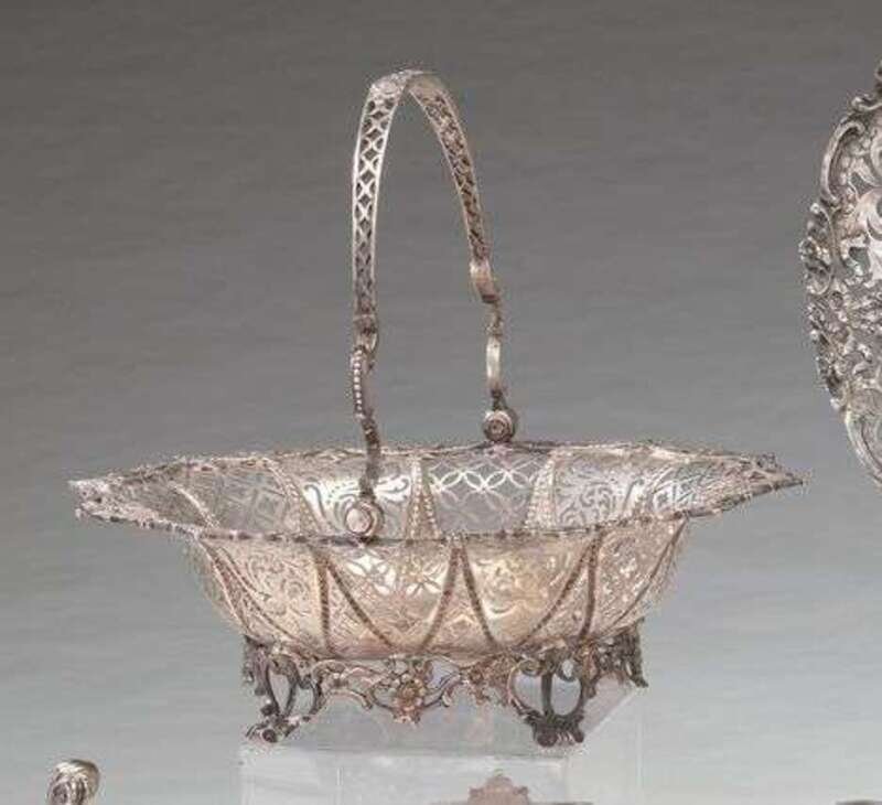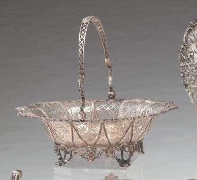 With a swing handle, the diamond shaped paneled sides decorated with stylized foliate scrolls, on an ornate open work base with shell cast feet.