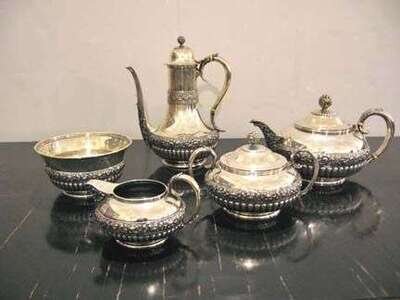 Comprising an coffee pot, tea pot, covered sugar bowl,creamer and slop bowl. Coffeepot, H: 9, tea pot, H: 5 1/2 in. 88 oz.