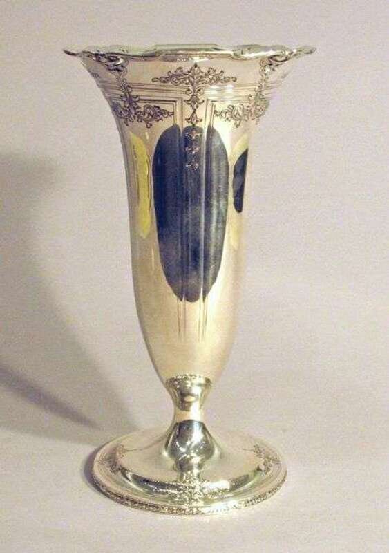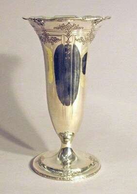 Retailed by Berry & Co. Washington, of paneled flared form, the shaped rim pierced with classical urns and decorated with scrolling foliage and trailing bellflowers, raised on a conforming circular foot. H; 13 3/4 in. 31 oz. approx.