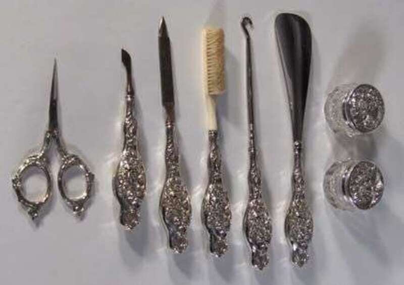Eight piece sterling silver toiletry set late 19th century