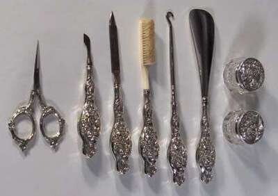 Comprising a small brush, a button-hook, a shoehorn, a nail file, a cuticle cutter, a pair of scissors and two silver mounted glass jars, all with foliate repousse decoration.