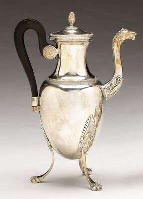 Of vase form, raised on three outscrolling paw feet, surmounted by anthemion and sphinx masks, the ovoid sides with bands of further anthemions and beading, with a scroll wood handle and s-scroll spout with a horse mask terminal, surmounted by a bud finial. H: 12 3/4 in. 32 oz. Provenance: Sold by Christie's, New York, 'The Property of a Europeon Collector', October 17th, 2002, lot number 167.