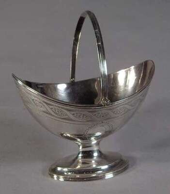 Of boat shape form with a reeded swing handle, the sides with bright cut decoration, raised on an oval foot. H: 4 1/2 in. 6 oz.