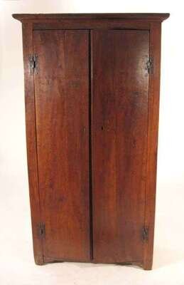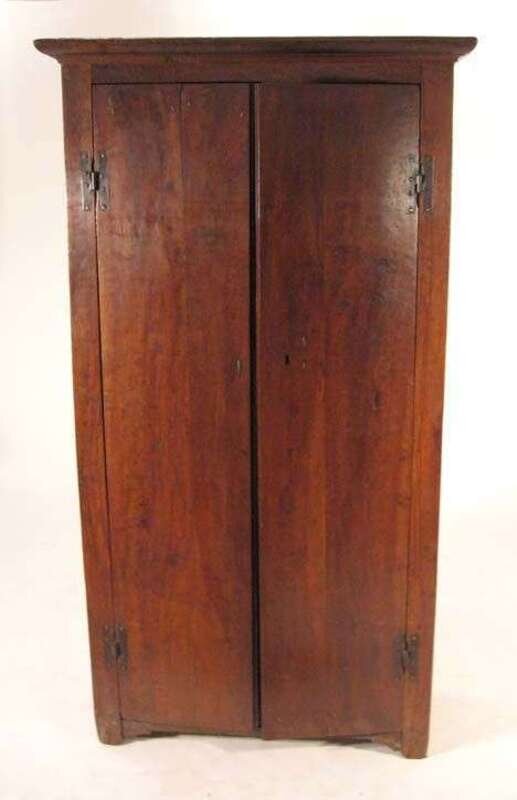 The molded cornice over plain double doors with H-shape iron hinges, opening to reveal a void interior, on shaped feet. H: 73 1/2, W: 39 3/4, D: 21 1/2 in.