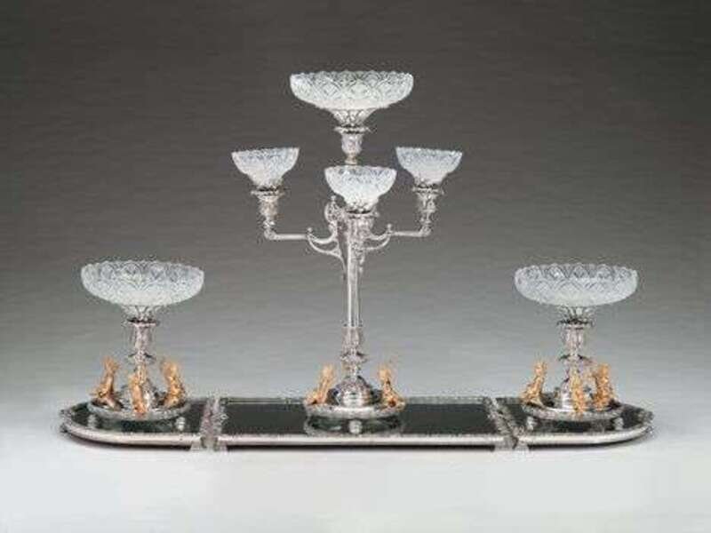 Comprising an epergne, two dessert stands and a three section plateau, the epergne with a circular base applied with three bacchic figures, the lappet clad stem surmounted by a cut glass circular bowl and three outscrolling branches, terminating in three further glass bowls, flanked by two conforming dessert stands, the plateau with a foliate scroll and shell cast edge, raised on ogee bracket feet. Epergne, H: 25 1/2, dessert stands, H: 11, plateau, W: 44 in.