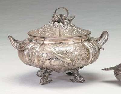 The sides chased and embossed with lobsters, fish, scrolling foliage, fruit and vegetables, with twin serpent handles, raised on four dolphin feet. H: 9, W: 12 5/8 in. 56 oz.