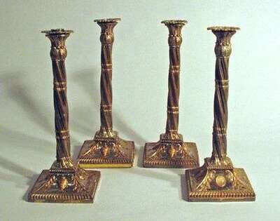 The gadrooned square base decorated in relief with urns and foliage, the spiral stems surmounted by leaf cast candle nozzles. H: 13 in.