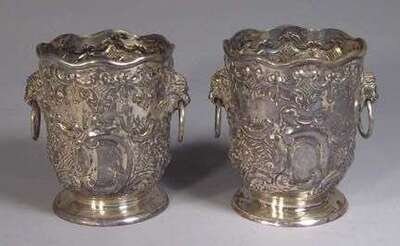 The repousse decorated sides with a wavy rim and twin lions mask and loop handles, raised on a circular foot. H: 4 in. 9 oz.