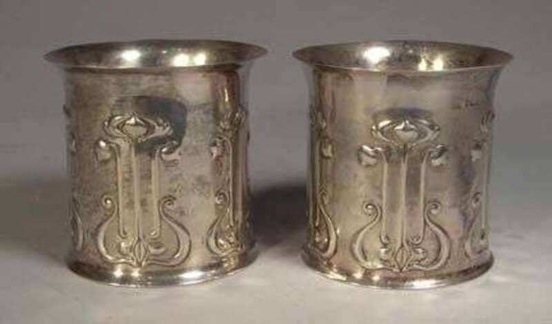 Retailed by Sussex Goldsmiths Co. Brighton, the cylindrical sides with flared rims and embossed with stylized plant forms. H: 3 1/2 in. 10 oz.
