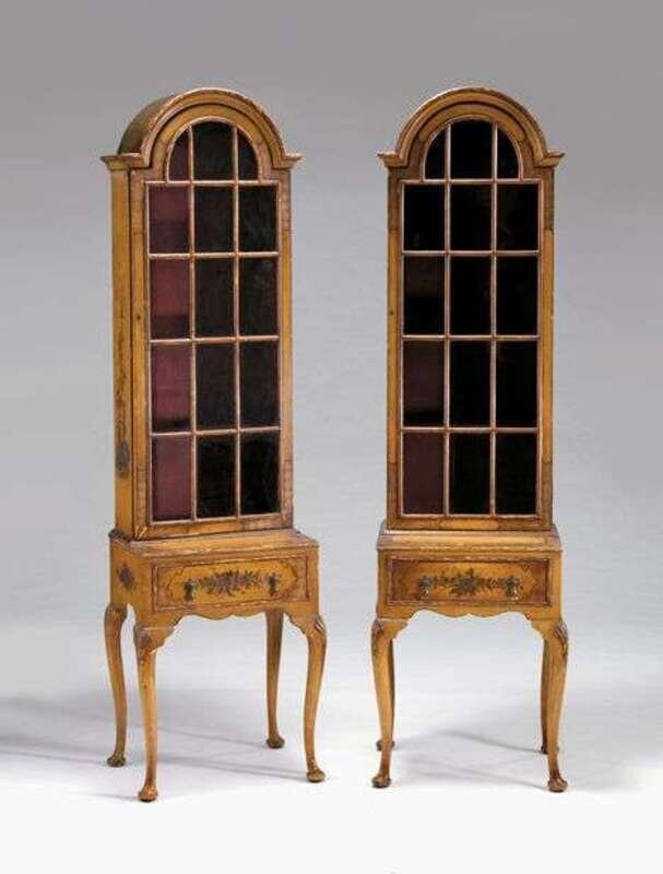 With figural and foliate chinoisierie decoration, the domed tops over a glazed panel door, enclosing shelves, the lower section with one frieze drawer, raised on shell carved cabriole legs with pad feet H: 76, W: 20, D: 15 1/4 in.