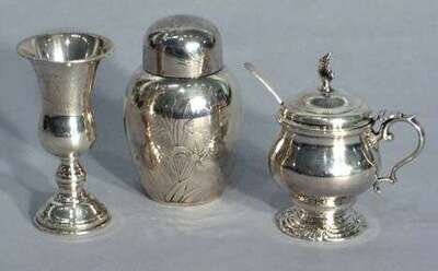 Of Chinese form, the cover and ovoid sides engraved with flowers. H: 4 in; together with an English sterling silver mustard pot and a sterling silver sherry glass. 11 oz. (3).