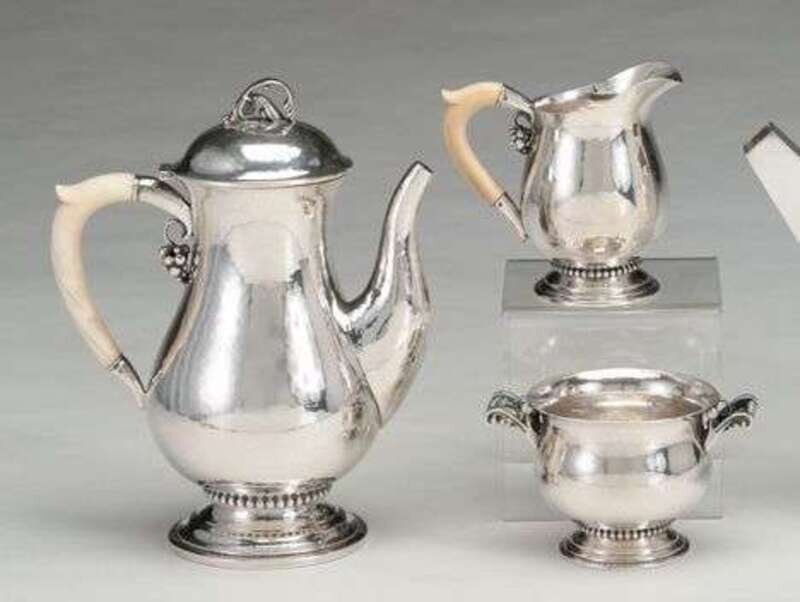 Danish hammered sterling silver and ivory three piece tea service early 20th century