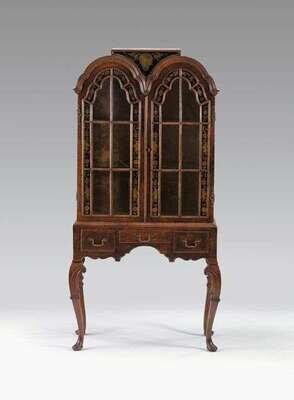With some earlier components, the double domed top centered by an eglomise panel, over two astragal glazed panel doors, flanked and surmounted by further eglomise panels, the stand with three short drawers above a shaped apron raised on cabriole legs, ending in pad feet. H: 67, W: 33 1/2, D: 14 1/2 in.