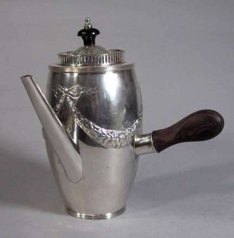 The baluster sides embossed and engraved with ribbon tied foliate swags and a turned wood handle, the lid surmounted by a turned finial and with a pierced gallery.